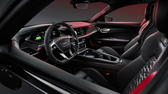 Het ruime en comfortabele interieur van de Audi e-tron GT en RS e-tron GT straalt een nieuwe vorm van sportiviteit uit. Het centrale deel van het dashboard is op de bestuurder gericht. De Virtual Cockpit Plus en het in een pianozwarte behuizing gevatte MMI display dragen bij aan een cleane uitstraling. De zitpositie voorin is sportief laag. Tussen de standaard sportstoelen bevindt zich een brede en ruime middenconsole. Ook achterin biedt de e-tron GT veel ruimte voor volwassenen. Door uitsparingen in het accupakket heeft Audi hier ‘voetgarages’ weten te creëren. Het resultaat: een sportieve, lage zitpositie én voldoende beenruimte. Het nieuwe ‘leather-free designpakket’ laat zien hoe de toekomst van luxe er uit ziet: in plaats van leder gebruikt Audi bekleding die is gemaakt van gerecyclede materialen.