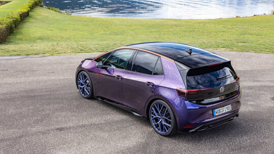 Voor dit unieke model is de speciale kleur Electric Violet met pareleffect ontwikkeld. Deze exclusieve lak bevat, naast de donkerblauwe basiskleur, glasparels die voor een bijzonder kleureffect zorgen. Afhankelijk van de lichtinval verandert de kleur van donkerblauw naar violet, of zelfs zwart. De Flaming Red daklijst voegt een sportief accent toe, terwijl de zijkanten van de ID.3 zijn verfraaid met folie in een geometrisch FIRE+ICE-patroon. Een ander opvallend kenmerk zijn de 21-inch velgen, die met hun blauwe geanodiseerde lakafwerking en glanzende details het dynamische uiterlijk versterken. Het originele FIRE+ICE-logo uit de jaren 90 prijkt trots op de B-stijl en de dakrandspoiler.