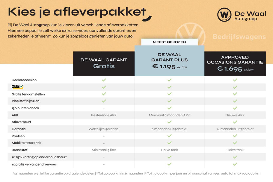 Standaard heeft iedere auto bij De Waal het ‘De Waal Garant’ pakket. Dat is inclusief een NAP-kilometerstand, gratis tenaamstelling, het bijvullen van de vloeistoffen, de resterende APK en de wettelijke garantie. U kunt natuurlijk ook voor meer garanties en zekerheden kiezen. Wij informeren u graag naar de verschillende afleverpakketten en de bijbehorende meerprijs hiervan. Hoewel de informatie op deze internetsite zo accuraat en actueel mogelijk wordt weergegeven zijn wijzigingen of fouten te allen tijde voorbehouden. Aan de inhoud van de site kunnen derhalve op geen enkele wijze rechten worden ontleend. Staat de auto van uw voorkeur niet bij ons op voorraad dan kunt u ons uw wensen mailen en gaan wij voor u op zoek. U bent vanzelfsprekend van harte welkom in onze schitterende showroom te Tiel, voor vragen kunt u ook bellen naar 085-0662913 of stuur een e-mail naar: verkoop@dewaalautogroep.nl